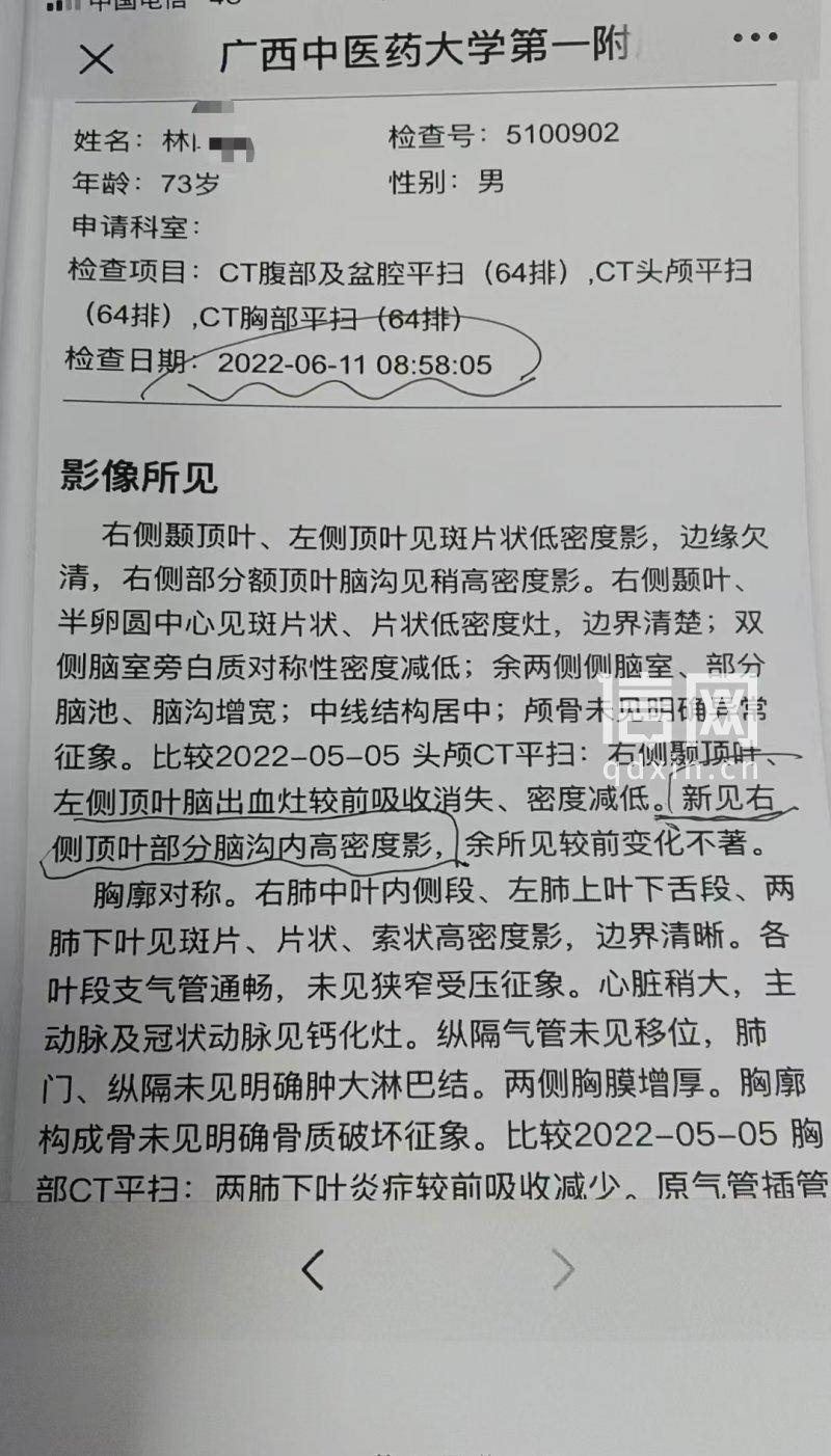 人一直在医院,怎么会病情急转直下?事后,林女士查看了父亲一段时间的诊疗记录 ,发现在第二次住院,也就是3月9日之后,父亲就没再服用过降压药。在发病前半个月也就是6月11日的CT检查报告中,有一条“新见右侧顶叶部分脑沟内高密度影”,“这就意味着当时我父亲就有了脑出血的早期症状,但当时医生没有任何干预 ,也没有告知过家属我父亲的病情有变化。”林女士说。