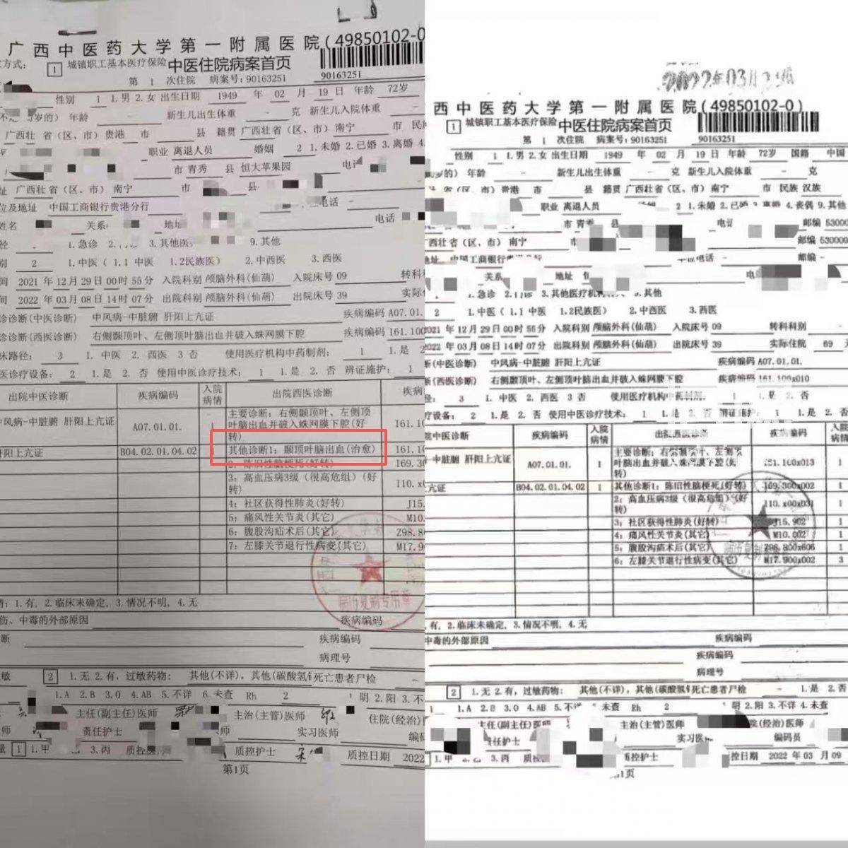 林女士说,自己在2022年6月和7月两次到医院复印了父亲的病历。病案号相同的两份病历,3月9日的出院诊断是有差异的,其中一份的第一条就是“颞顶叶脑出血(治愈)”,另一份里却没有这一记录。