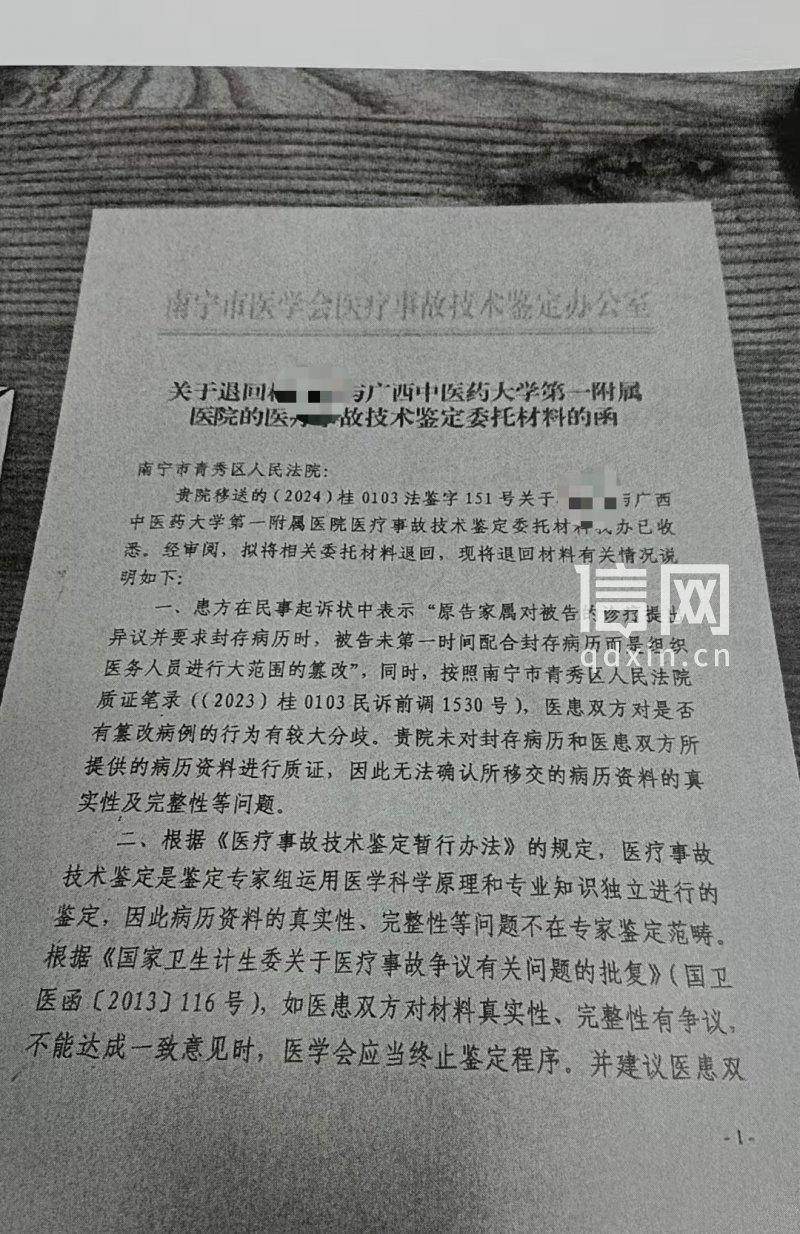 林女士提供了一份南宁市医学会医疗事故技术鉴定办公室下发的《关于退回XXX与广西中医药大学第一附属医院的医疗事故技术鉴定委托材料的函》,其中写明:“医患双方对是否有篡改病历的行为有较大分歧,贵院未对封存病历和医患双方所提供的病历资料进行质证,因此无法确认所移交的病历资料的真实性及完整性等问题。根据《医疗事故技术鉴定暂行办法》的规定,医疗事故技术鉴定是鉴定专家组运用医学科学原理和专业知识独立进行的鉴定,因此病历资料的真实性、完整性等问题不在专家鉴定范畴。”